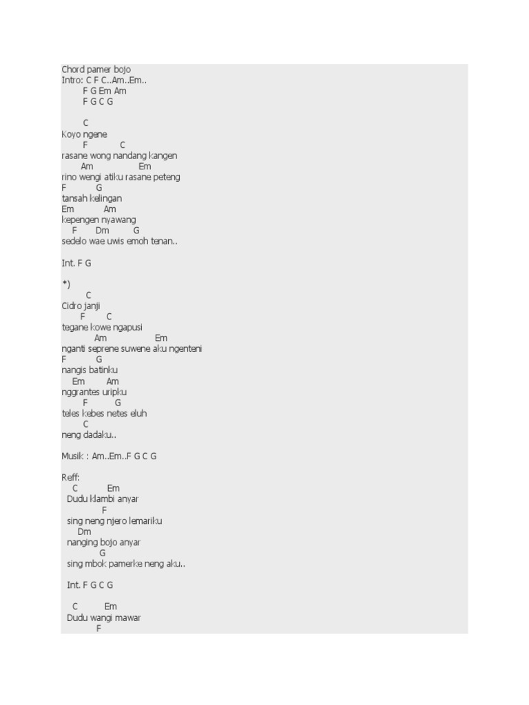 Aku malu aku malu aku malu. A Fm Bm E A Inikah oh namanya Fm insan sedang jatuh cinta Bm E Mengapa semua begitu A Fm indah dilihat Begitu sedap dipandang Bm C Fm Seolah kuingin slalu tersenyum Em A D E Tapi ah aku malu padamu A Fm Bm E Aku malu aku malu aku malu A Fm Bm E. Intro A Cm D A Fm Cm D E A Cm jika engkau bertanya D A sepedih apa hidupku Fm Cm cukup tatap mata ini D E dan kau rasakan dan kau rasakan chorus D E ku ikhlaskan apa adanya aku A D tanpa harus aku mengeluh Bm E karena ku yakin Tuhan lebih tahu A ini terbaik untukku D E tak perlu lagi ada air mata A D hidupku belum habis semua Bm E karena ku yakin Tuhan masih ada A dan akan selalu ada int A Cm D A Fm Cm D E A Cm aku malu padamu D A tahu kekuranganku Fm Cm tapi aku lebih malu. Capo di fret 2 Intro G Em G Em G D Resah dan gelisah menunggu di sini G C D Di sudut sekolah tempat yang kau janjikan G C D Ingin jumpa denganku walau mencuri waktu D G Berdusta pada guru G D Malu aku malu pada semut merah G C D Yang berbaris di dinding menatapku curiga G C D Seakan penuh tanya sedang apa di sini D G Menanti pacar jawabku Chorus G Bm C D G C D Sungguh. Chord Wali Aku Tidak Malu - intro A Cm D A Fm Cm D E A Cm jika engkau bertanya D A sepedih apa hidupku Fm Cm cukup tatap mata ini D E dan kau rasakan dan kau rasakan chorus D E ku ikhlaskan apa adanya aku A D tanpa harus aku mengeluh Bm E karena ku yakin Tuhan lebih tahu A ini terbaik untukku D E tak perlu lagi ada air mata A D hidupku belum habis semua Bm E karena ku yakin.